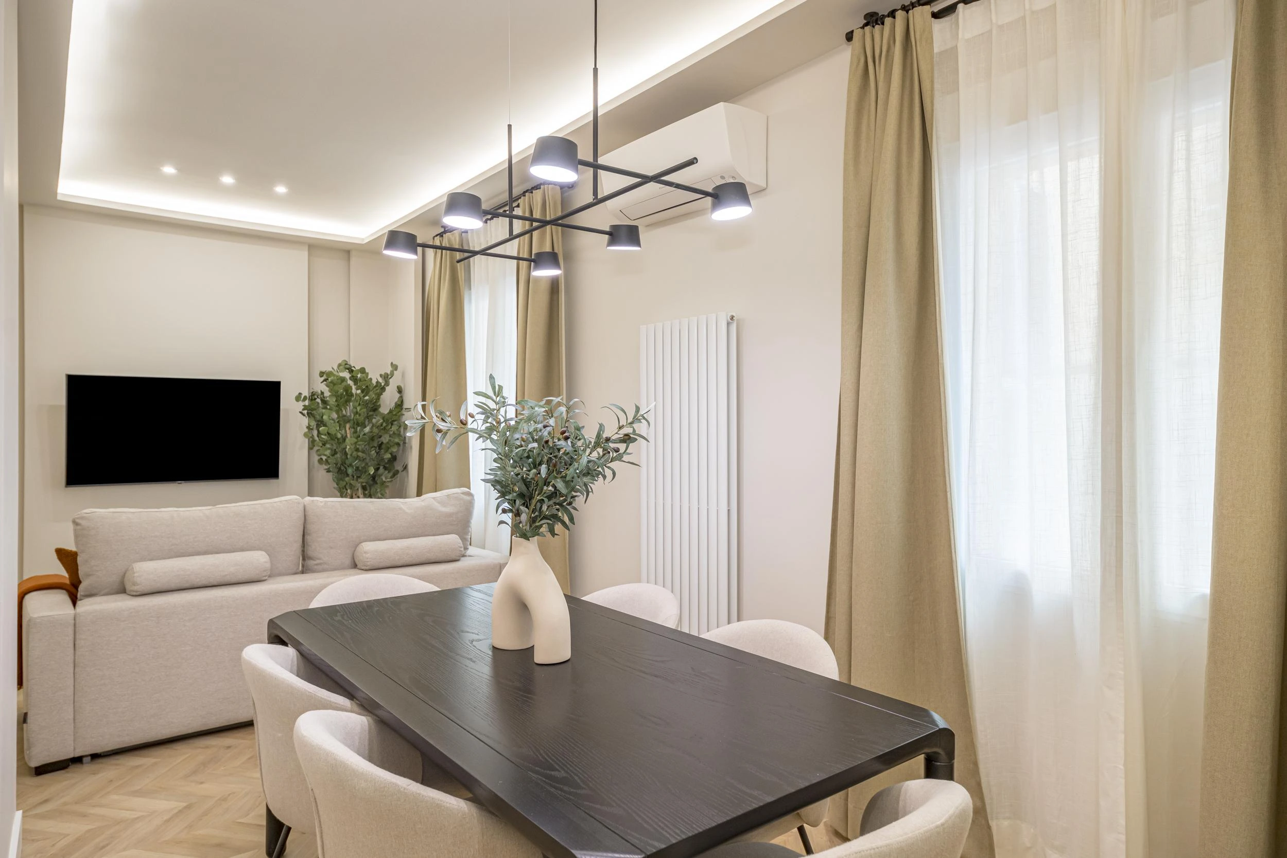 La propiedad cuenta con tres habitaciones y tres baños, la cocina, completamente equipada, se entrega amueblada con electrodomésticos modernos y acabados de alta calidad. Además, el edificio cuenta con ascensor, calefacción comunitaria, aire acondicionado y servicio de portería, garantizando una experiencia de vida cómoda y segura.